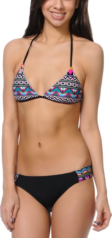 The Tribal PrintMake a bold statement as you hit the sand with these tribal print bikinis, for the inner Amazonian in you. Billabong Sun Kiss Halter Bandeau Top, $46, swell.com Sun Kiss Summer Pant Bikini Bottom, $38, swell.com Hurley Tribal Fusion Reversible Triangle Bikini Top, $23.95, surfoutlet.com Tribal Fusion Aussie Tab Side Bottom, $19.95, surfoutlet.com
