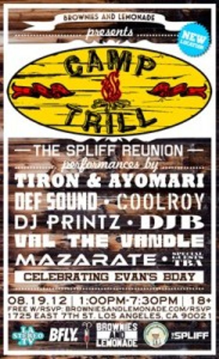 Why: Camp Trill Session 5 rolls on in the new location, rocking with a reunin of the classic LA hip hop party The Spliff, plus Evan Washington's birthday. Spiked lemonade, brownies, water guns, basketball and surprises. Performances by Tiron & Ayomari, Def Sound, Coolroy, Val The Vandle, DJ Printz, DJB, Mazarate, and special guests.
