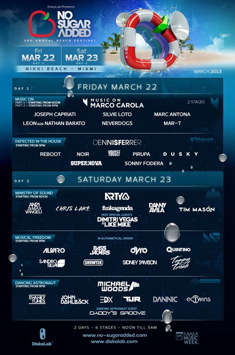 No Sugar Added is a beach festival that was imported from Australia for the 3rd year in a row. The 2 day festival features a range of styles, from the deep grooves of Dennis Ferrer, Noir, and Dusky, to the electro house anthems of Arty, Tim Mason, and Tommy Trash.