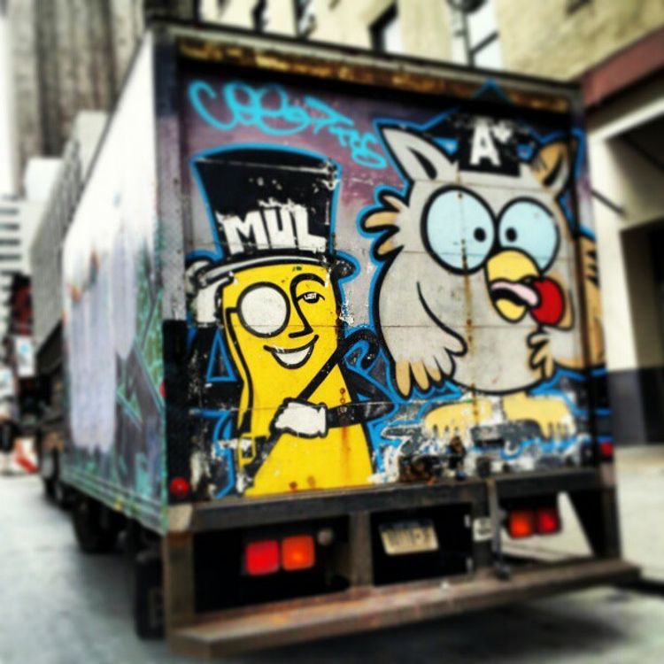 [Photo via @emathelier]Street Art on the GoThe Planters Peanuts man and the Tootsie Pop owl are traveling around town together on this delivery truck.