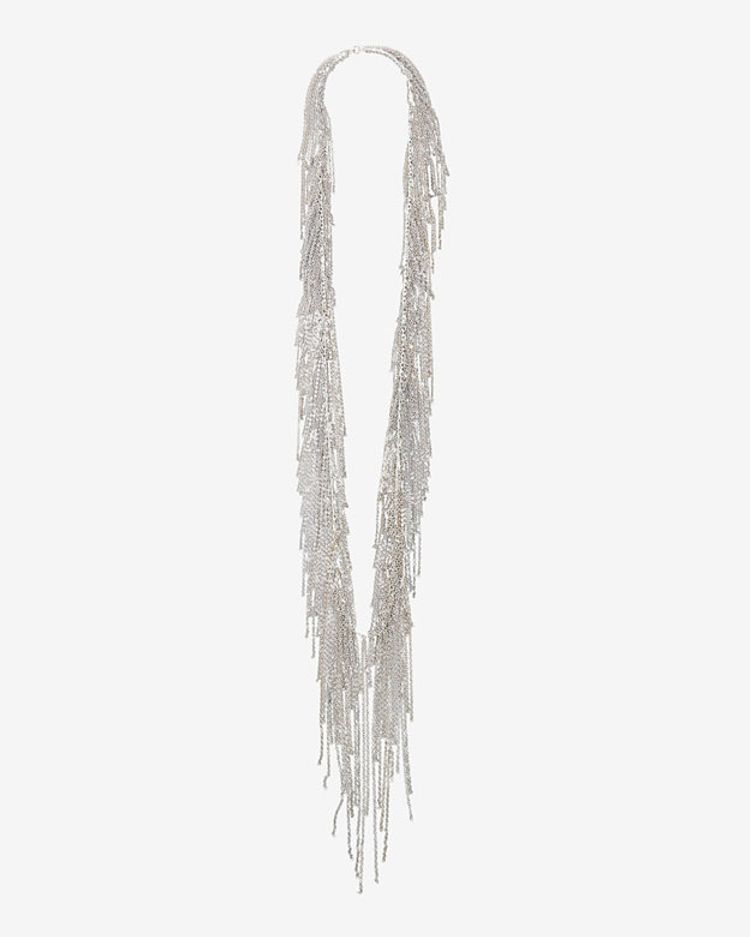 This delicate and girly necklace is perfect for layering. Extra long and rendered in silver, this fringy necklace provides an interesting contrast to a chunky metal choker.