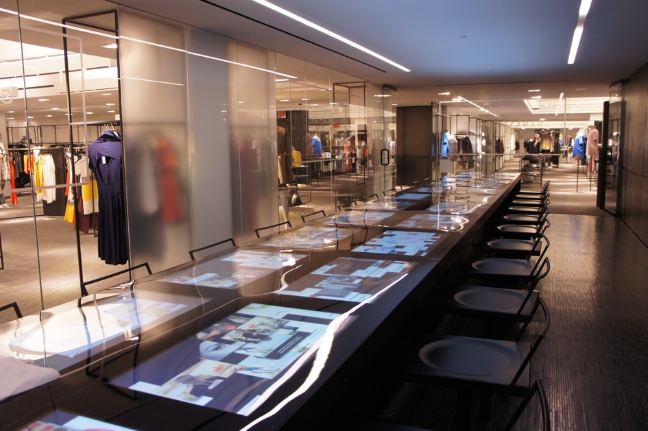 NYC design consultancy 2 x 4 was commissioned by Barney's to design the dining table and the result is a "digital river" with 28 individual screens. Users can seamlessly look at the menu, order food, call the server, browse Barney's New York merchandise, view articles and videos from Barney's blog,