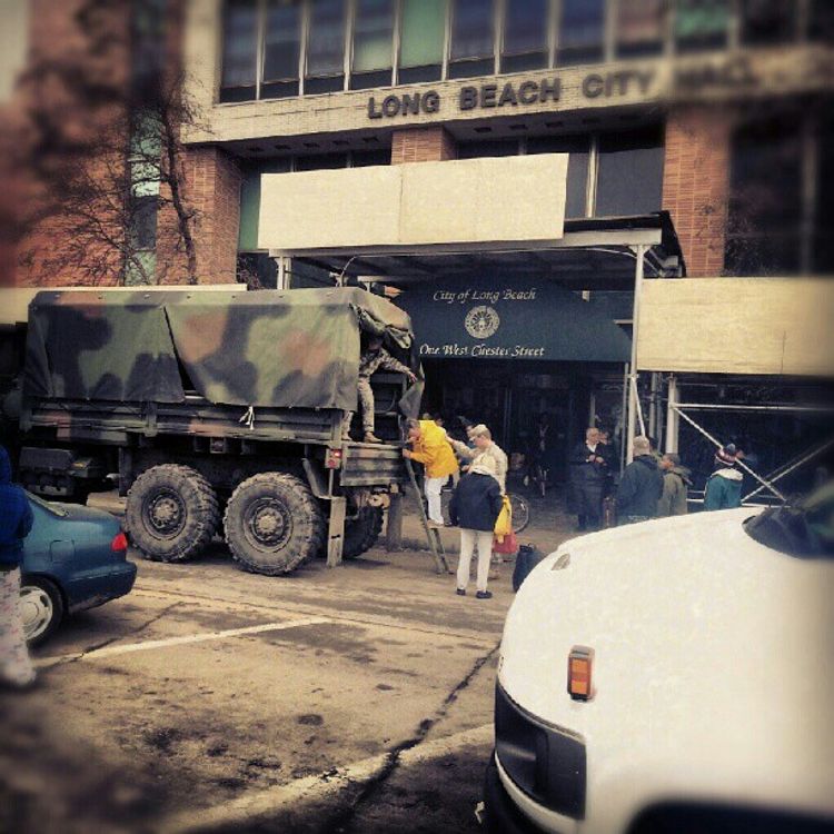 An army truck brings supplies and emergency personnel to Long Island