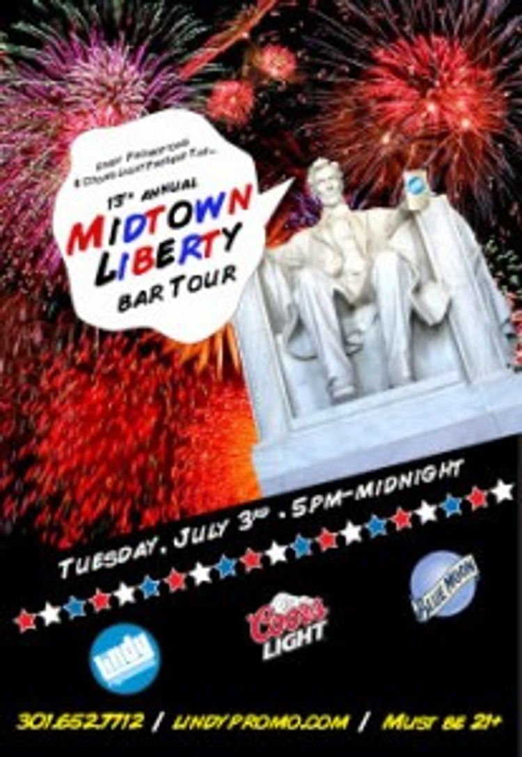 Where: Rumors, 1900 M Street NW When: July 3, 5pm-midnight Why: $10 cover gets you party favors and food and drink specials like $2 Coors Lights and $3 Blue Moons on this annual bar crawl with Lindy Promotions.13th Annual Midtown Liberty 2012 Bar Tour